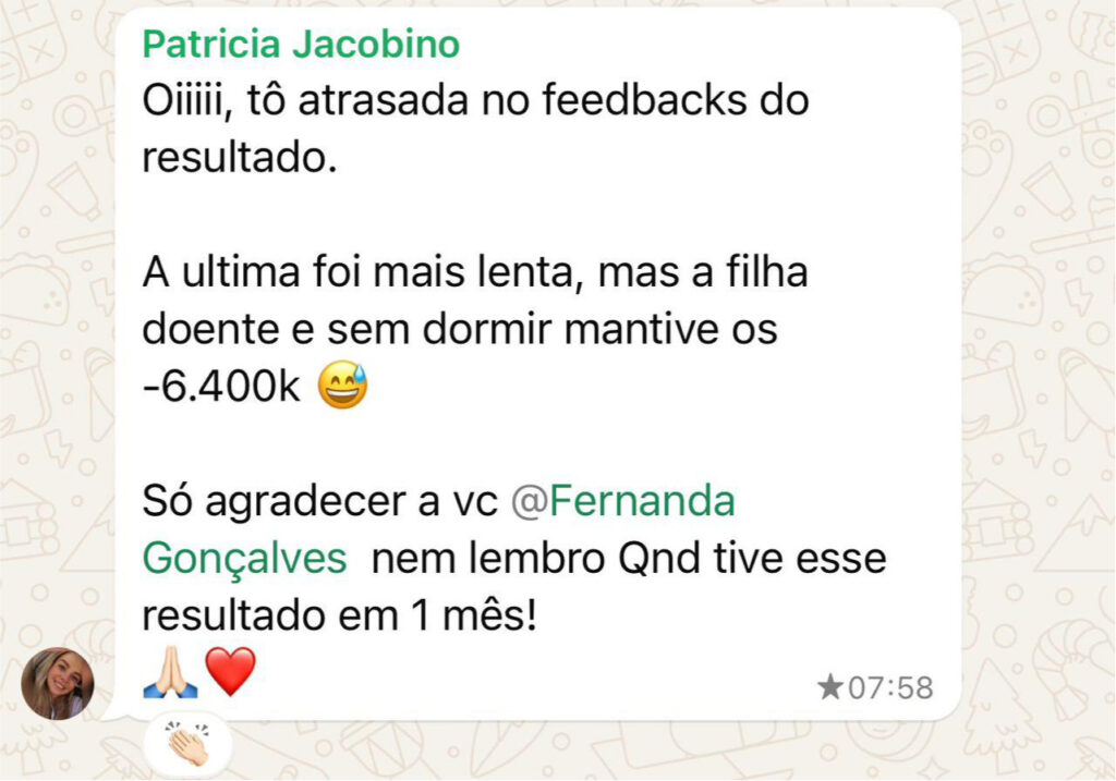 O programa tem duração de 3 meses, mas você terá acesso contínuo à plataforma por mais tempo, podendo continuar com o acompanhamento, materiais extras e bônus. Durante o período, Fernanda estará disponível para acompanhamento individualizado nos encontros quinzenais, além de suporte contínuo no grupo de alunas.